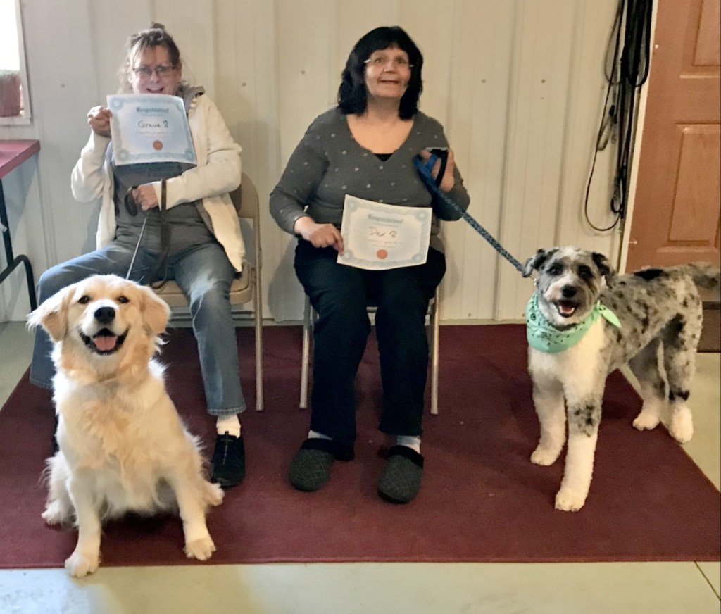 This weekend we had two pups graduate from a 1st level class. Lisa, owner of Dex(on the right), and Jackie, owner of Gracie(on the left), were so happy with classes that they signed up for the next level! They also decided that their pups would love to join us for daycare. It was so much fun to learn about these awesome dogs, and I can’t wait to see both of them back for the level 2 course! The level 2 courses will get their pups closer to becoming a therapy pet! Classes are starting up again soon. Make sure to get on the list!
