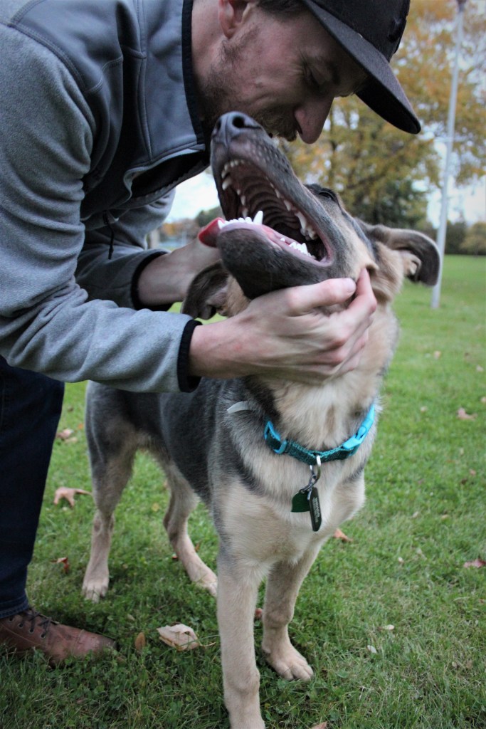 Indigo, the blue GSD puppy, learns how to play fetch with his dad at the park. There were so many distractions and he learned to play with no leash! 10/24/19