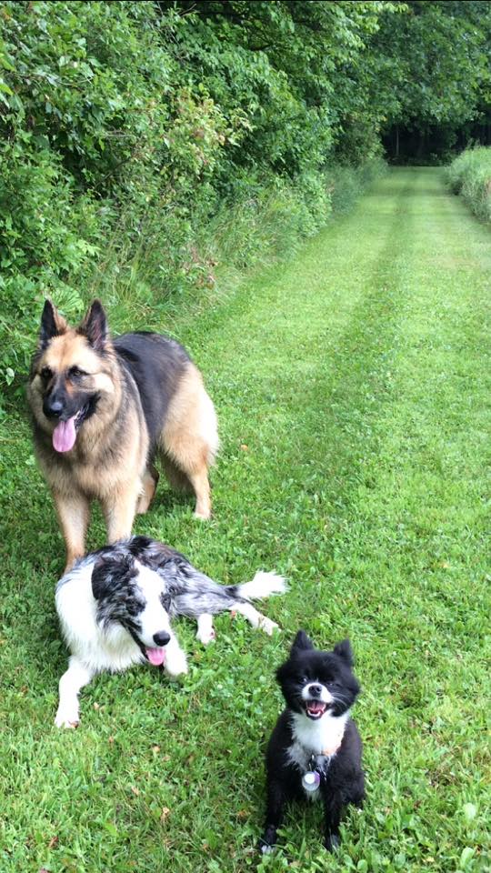 Here EKO & Kyanite take a break from jogging up and down the grassy trail with their friend Kura. Kura is an 8-year-old Pomeranian and loves her giant friends! 8/4/18